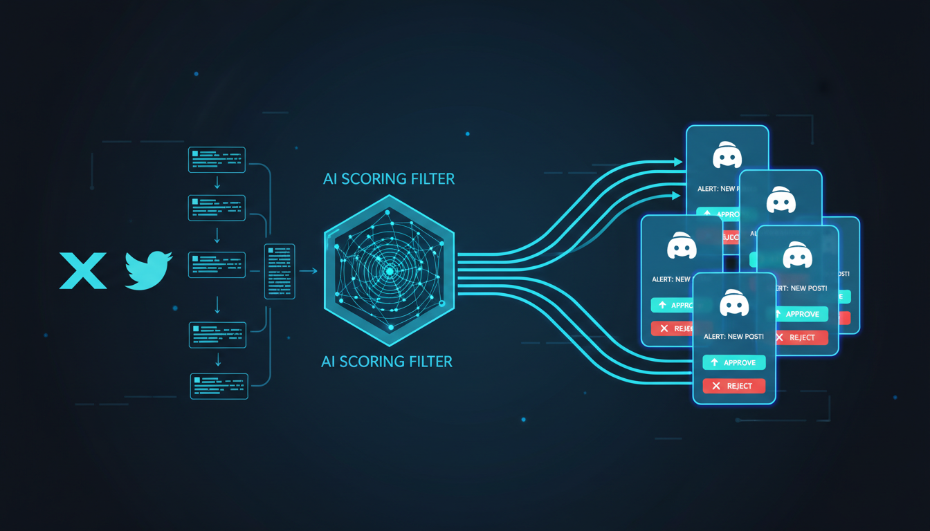 作業の自動化じゃない。武器の進化を自動化する。X監視→スコアリング→クラスタリング→Discord提案→Go/No-Go。構想から稼働まで1セッション。